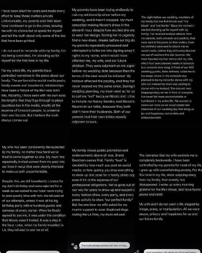 贝克汉姆大儿子布鲁克林在社交平台上发布长文自揭“家丑”,控诉贝克汉姆和维多利亚长期操控媒体叙事,试图破坏他与妻子妮可拉的感情,表示坚决不会和父母和解。